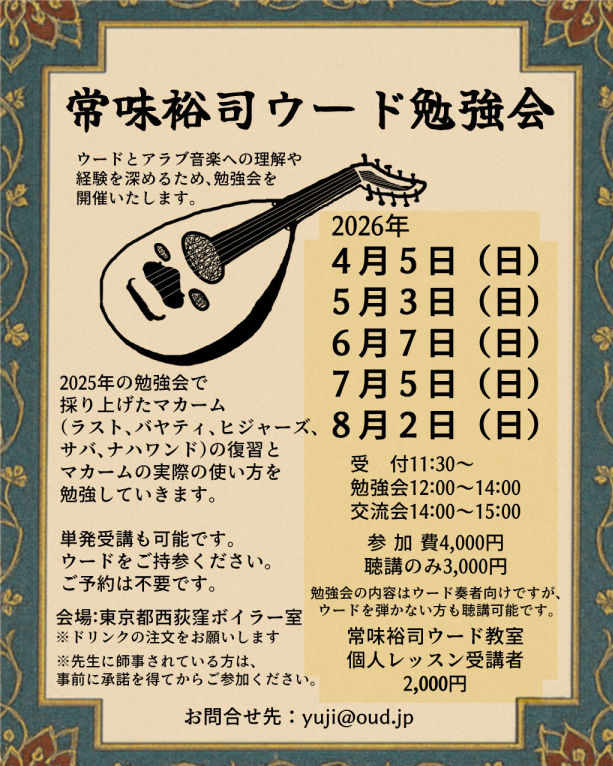 ウードとアラブ音楽への理解や経験を深めるため、勉強会を開催いたします。